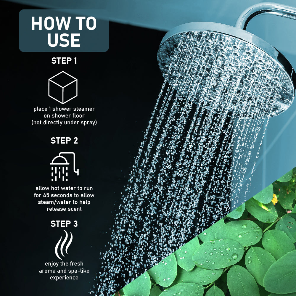 How to use: Place one shower steamer on shower floor (not directly under spray, but enough it gets a bit wet). Water will activate to create a ‘burst’ of aroma.